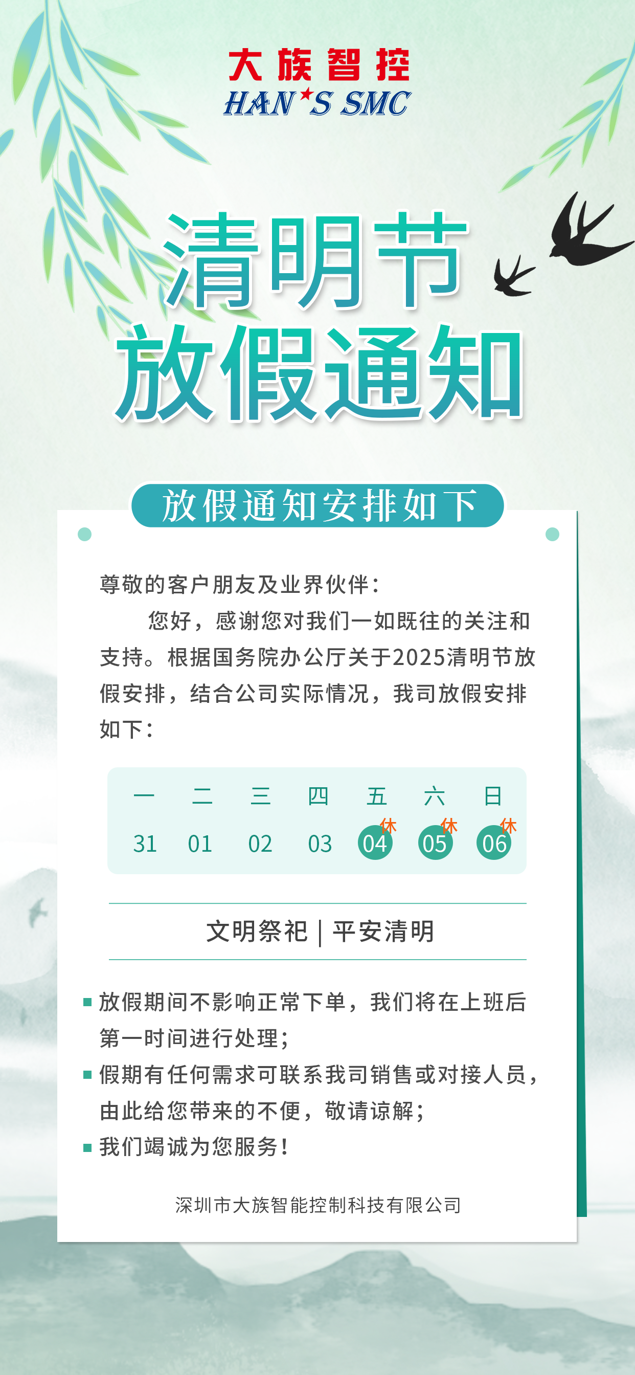 大族智控2025清明節(jié)放假通知