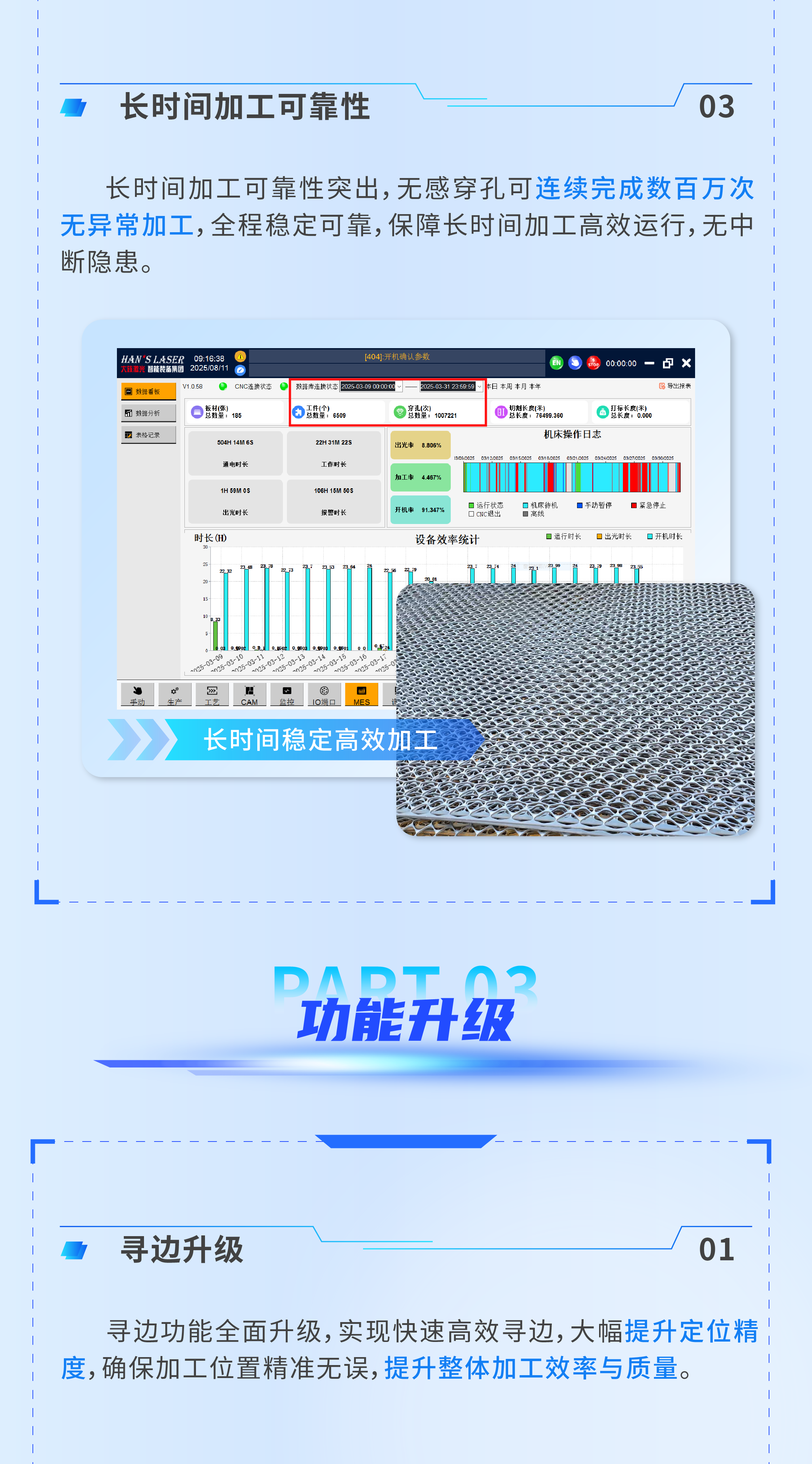 關(guān)鍵詞:大族智控、算法與硬件深度優(yōu)化、隨動(dòng)蛙跳性能大幅提升、蛙跳、無(wú)感穿孔、隨動(dòng)速度、硬件升級(jí)、下落防撞、長(zhǎng)時(shí)間加工可靠性、尋邊、板外切割、高速標(biāo)定