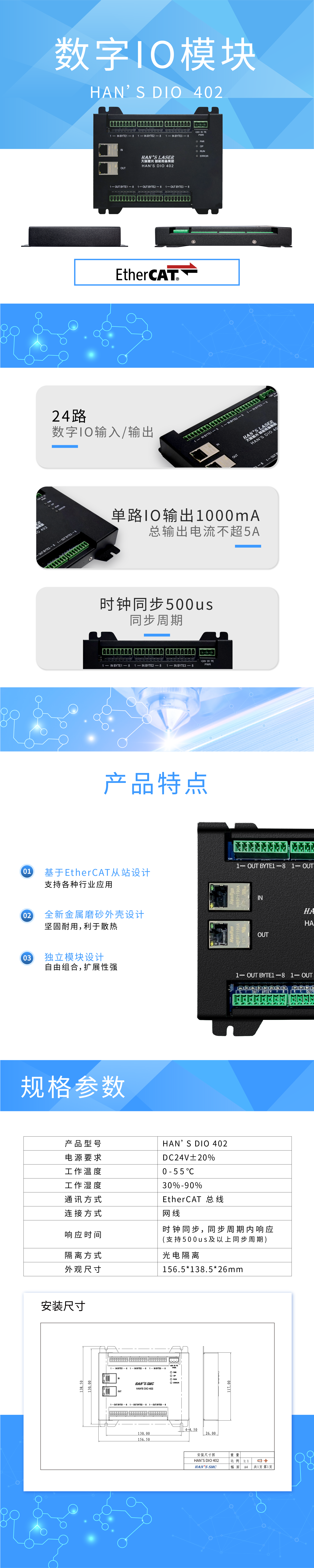 HAN’S DIO 402 數字量輸出模塊是基于EtherCAT總線技術設計的一款從站模塊,提供24個數字量輸出口,帶光電隔離,大電流驅動輸出。
