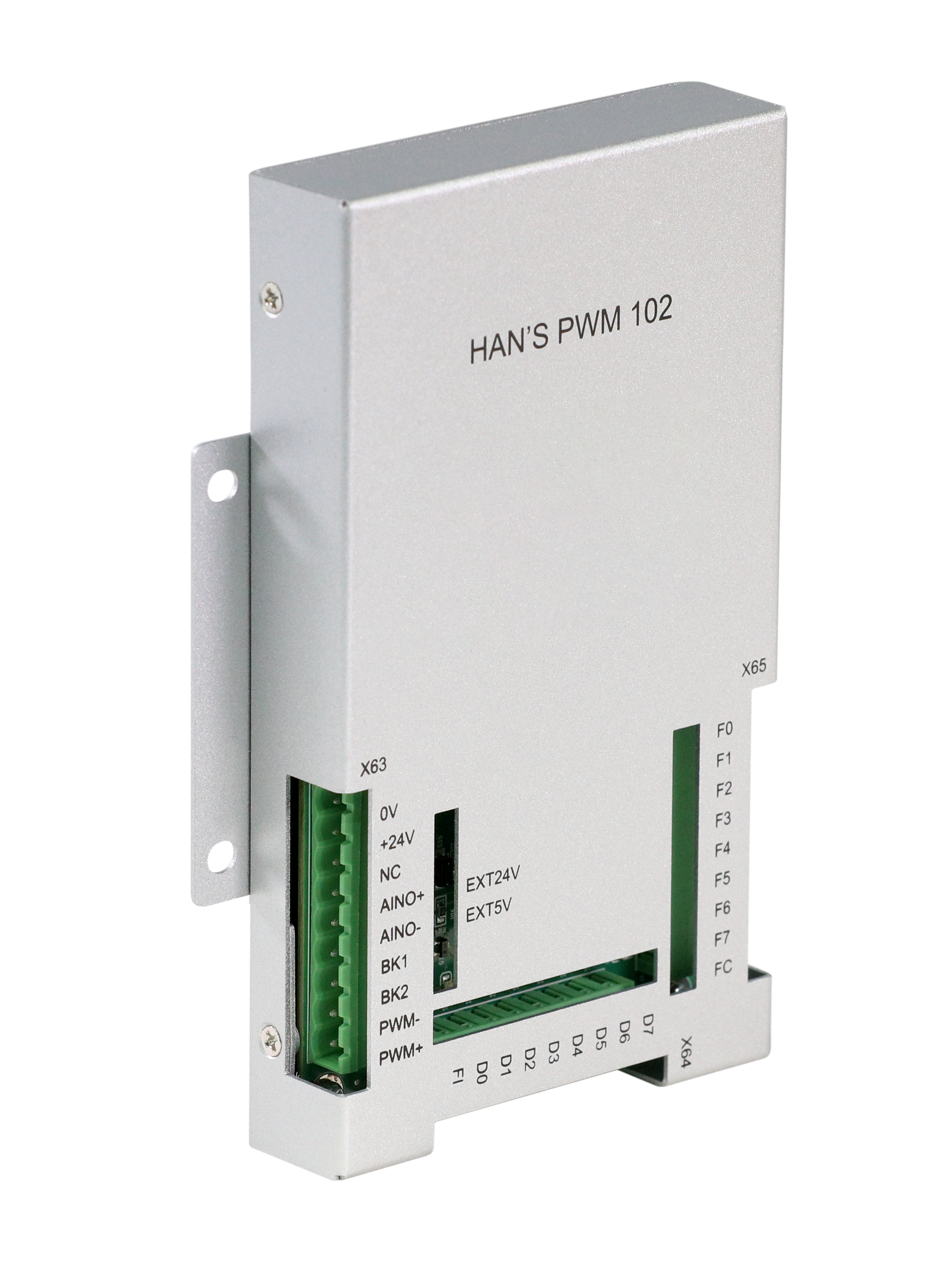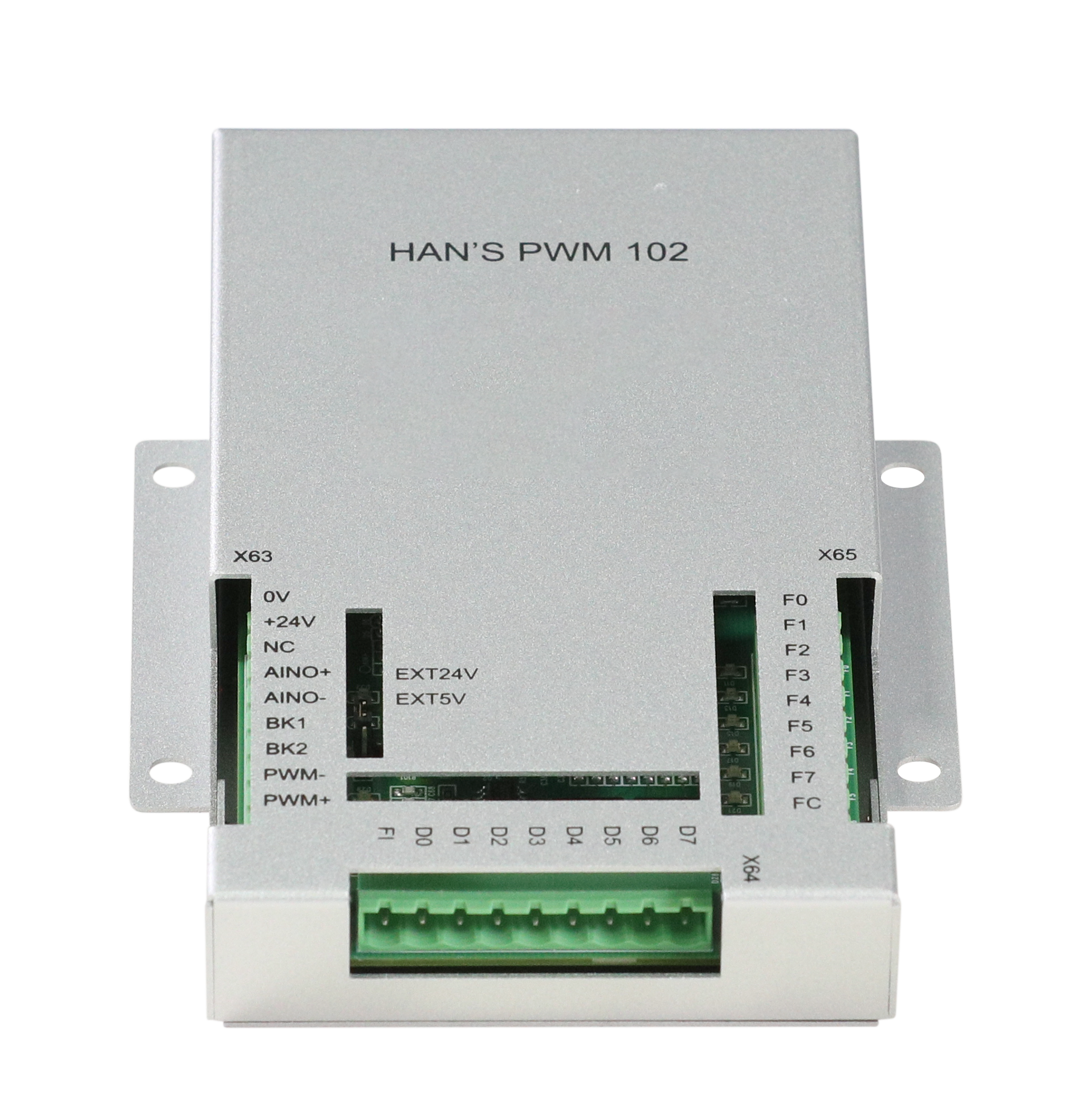 HAN’S PWM 102模塊采用工業上常用24V電源供電,能輸出 24V PWM 信號/5V PWM 信號。該模塊輸出頻率范圍寬,控制精度高,PWM信號頻率輸出范圍 0-50000Hz,占空比 0%-100%。為方便激光用戶使用,該模塊配有一個模擬量輸入口,用于實現速度跟蹤功能。